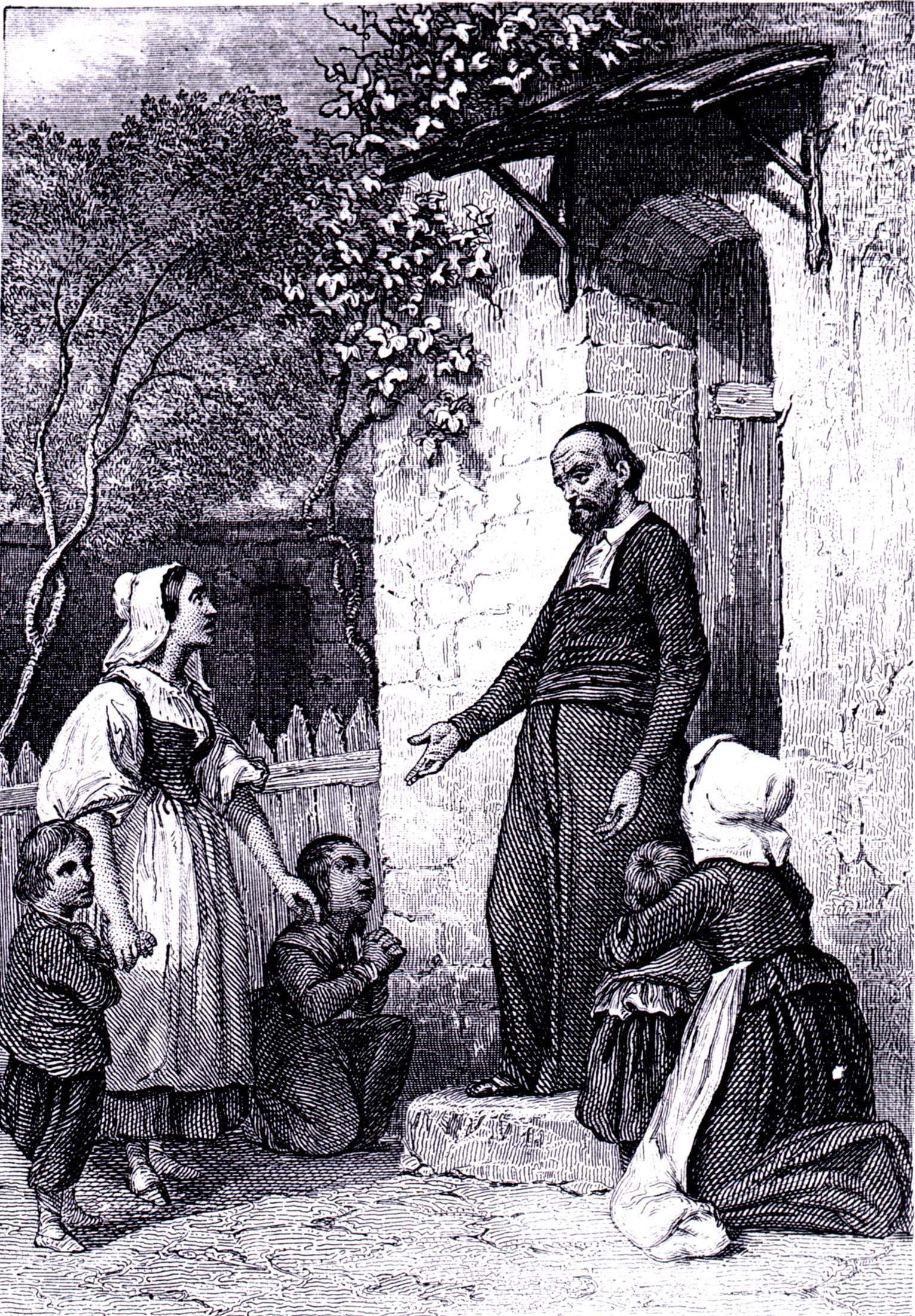 Book illustration (?); Vincent de Paul, standing, cassock, cincture, rabat of diocesan clergy, skullcap; accepts orphans from woman; Daughter of Charity kneeling at right