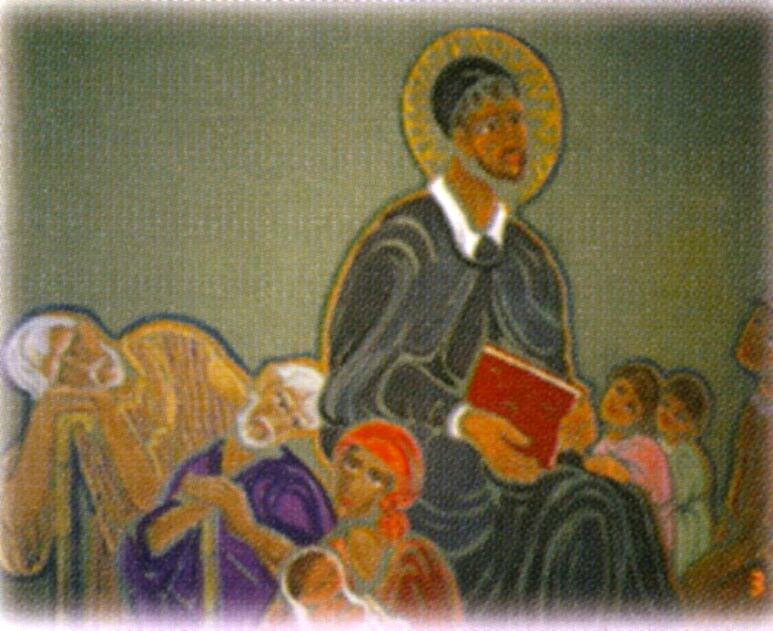 Vincent de Paul, sitting, cassock, cape, skullcap, halo, holding red book; instructing children, elderly men, woman with child; location of original unknown