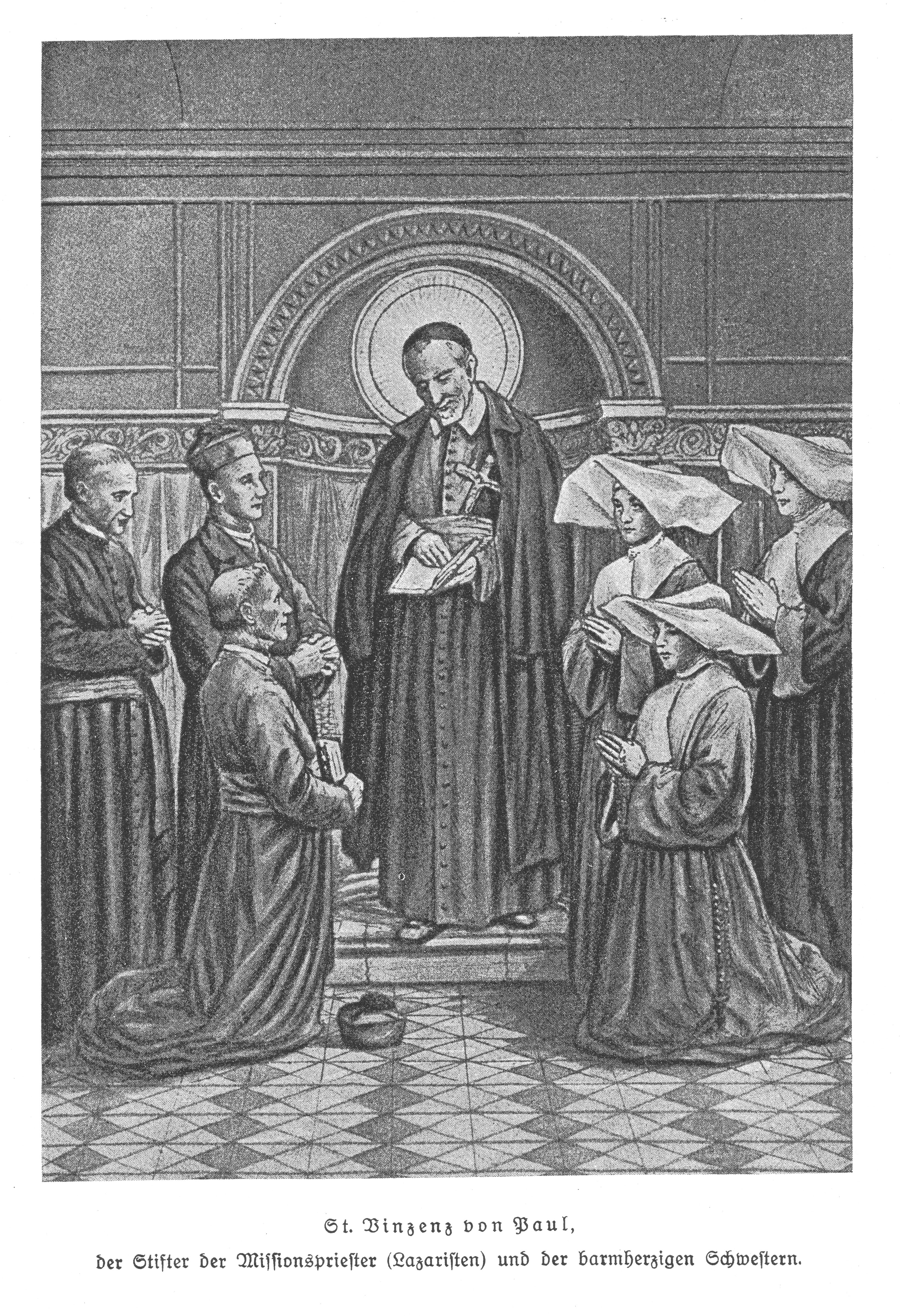 VdP, standing, cassock, cape, cincture, mission crucifix in cincture, skullcap, halo; reading from book; priests and sisters; German: Founder of the Priests of the Mission (Lazarists) and the Daughters of Charity; 1929, St. Vinzenz Kalendar