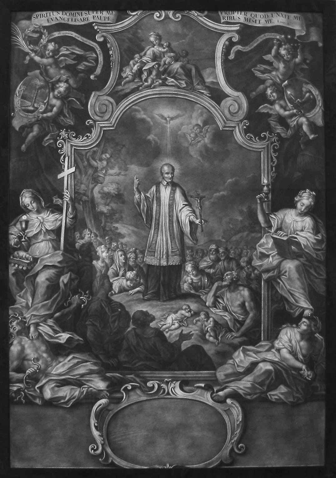 Vincent de Paul, standing, cassock, surplice, stole, gesture of preaching, holding crucifix, rural setting; dove of Holy Spirit above, with angels; rococo frame, Virgin Mary; original in Vincentian house, Stradom; paper