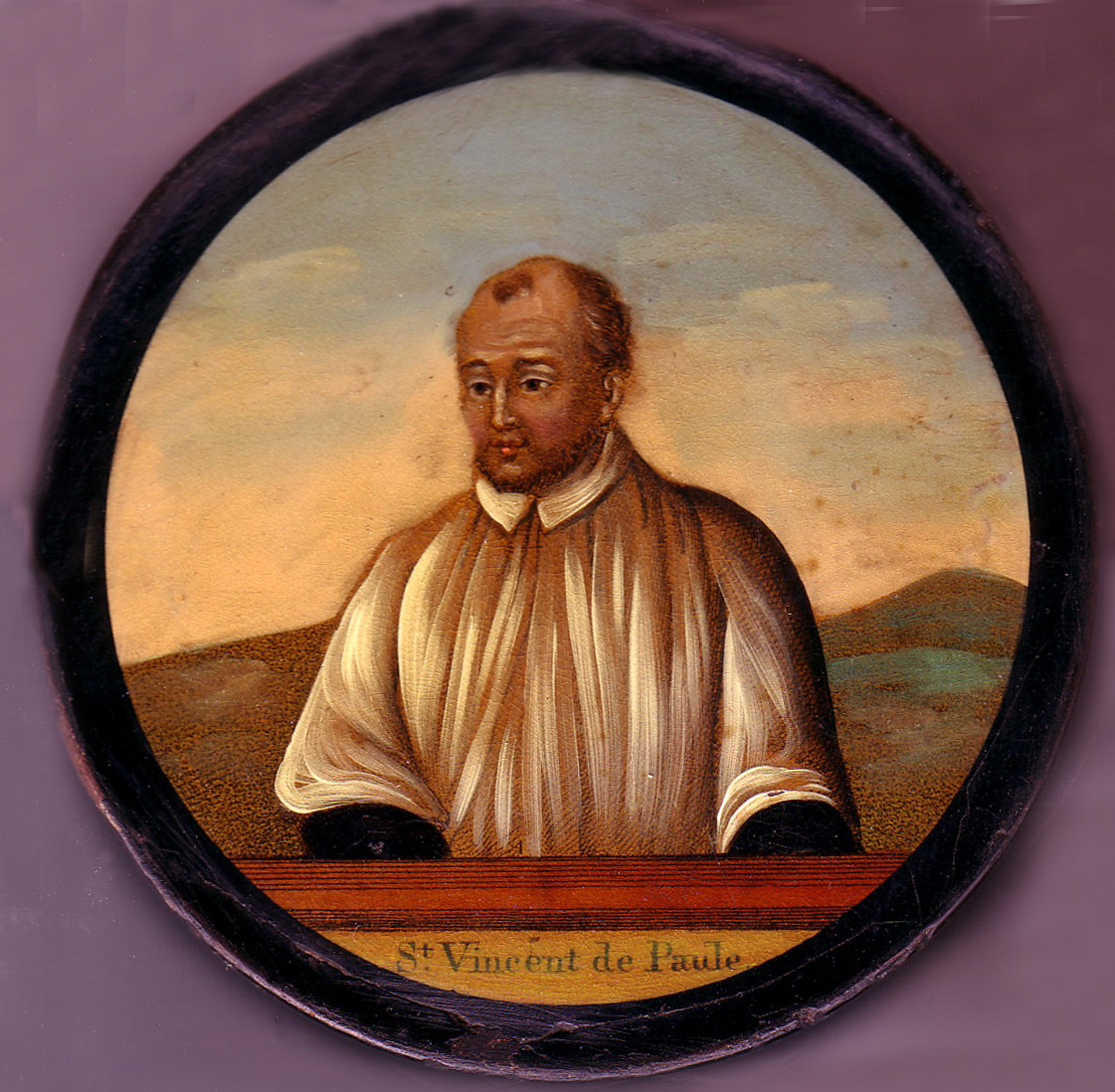 Vincent de Paul bust, cassock, surplice, no skullcap; shown in nature, skies, hills; name below in early 19th century spelling (Paule). DePaul University Special Collections