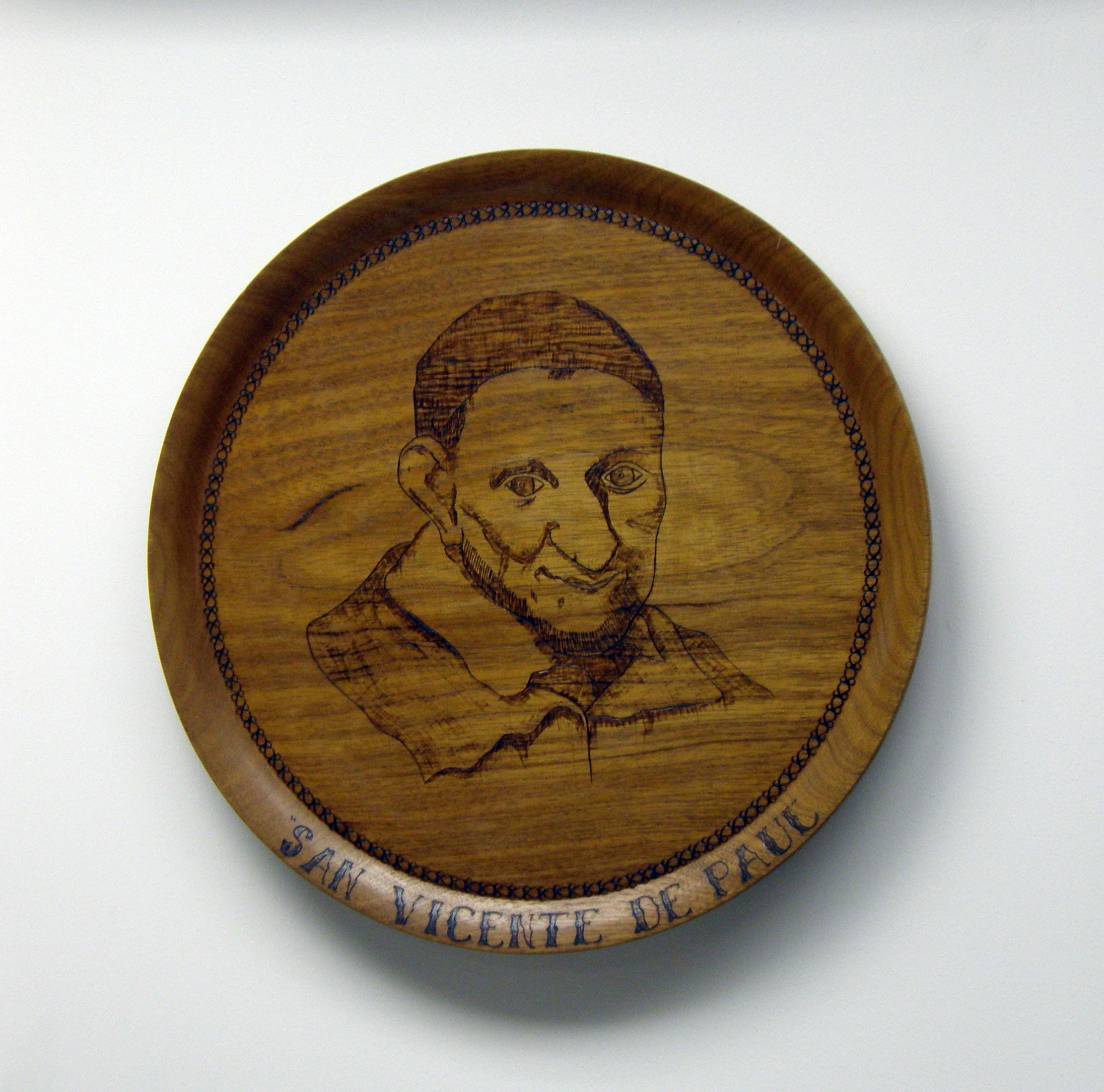 Round painted wood tray; Vincent de Paul bust, very large nose, title in Spanish, original from Guatemala; in Montebello Vincentian offices