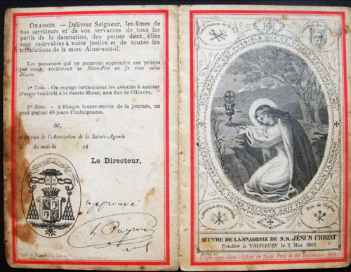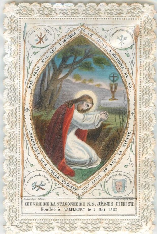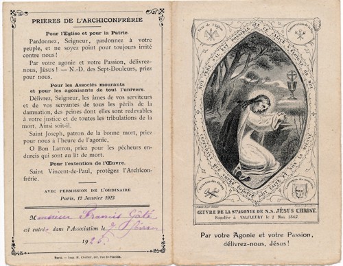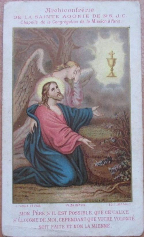 Holy Agony 01, altar piece, USA, PA, Germantown, SV church Holy Agony 02,, Confraternity, 1862 Holy Agony 03, membership holy card Holy Agony 04, mural, USA, PA, Germantown, SV church Holy Agony 05, Belgium, Andrimont Holy Agony 06, holy card, canivet 1 Holy Agony 07, holy card, canivet 2 Holy Agony 08, instruments of the Passion Holy Agony 09, membership card, 1926 Holy Agony 10, membership leaflet, undated Holy Agony 11, recto, verso, undated Holy Agony 12 Holy Agony 14, canivet Holy Infancy 01, membership holy card Holy Infancy 02, with Daughters of Charity The Christ of St. Vincent de Paul Vow Cross, Odessa, Ukraine