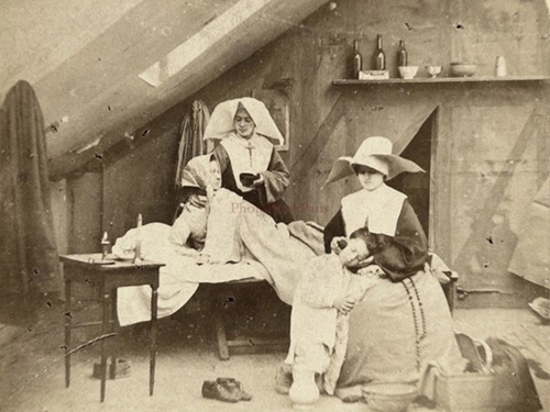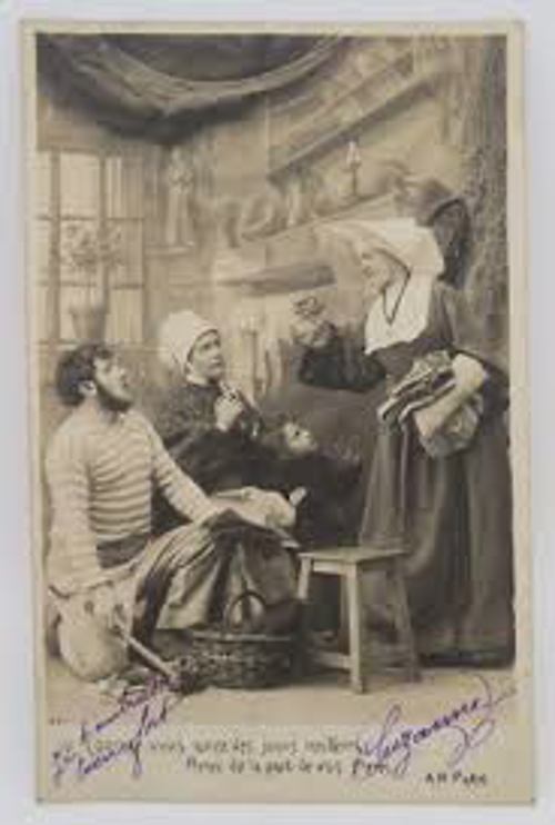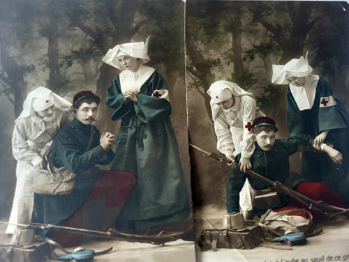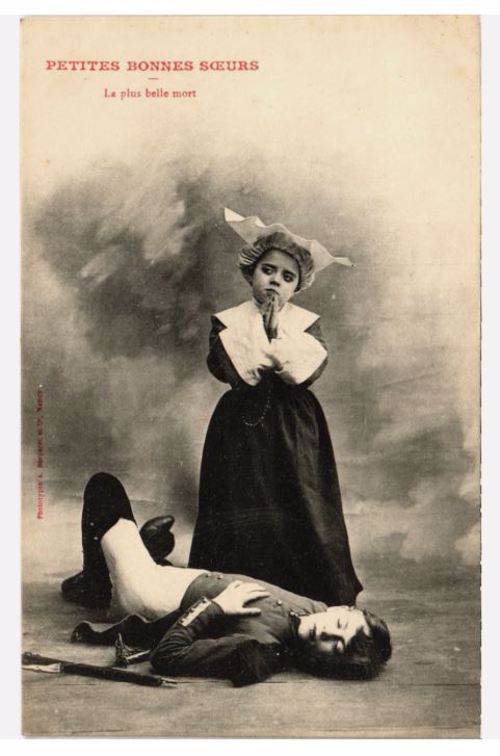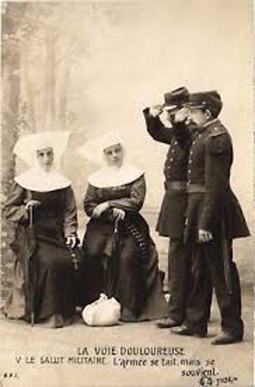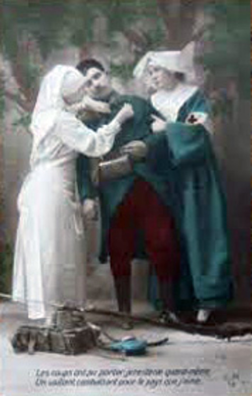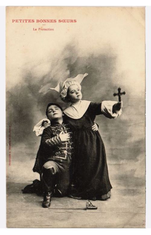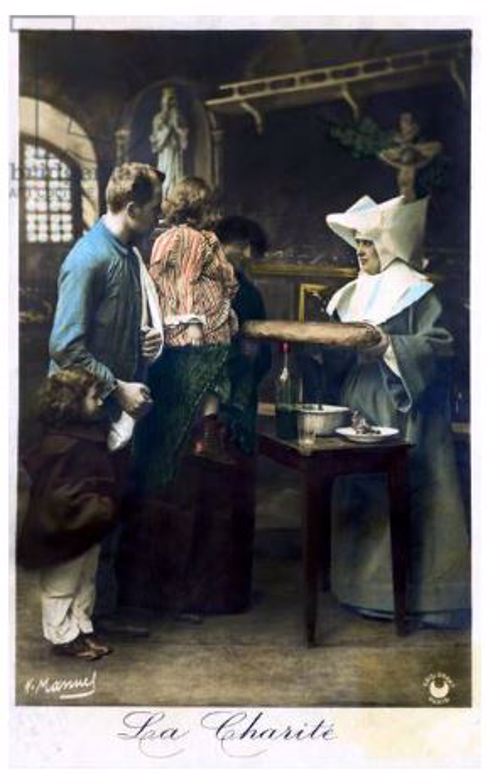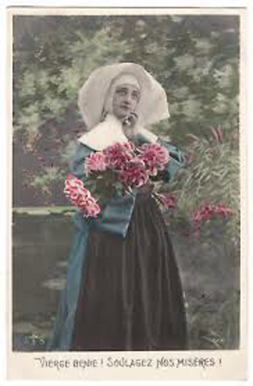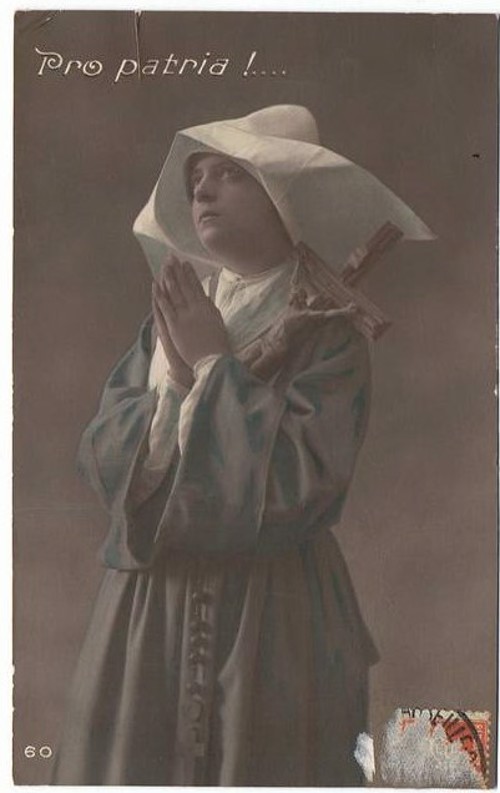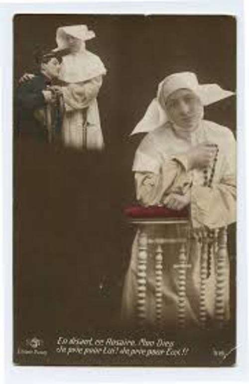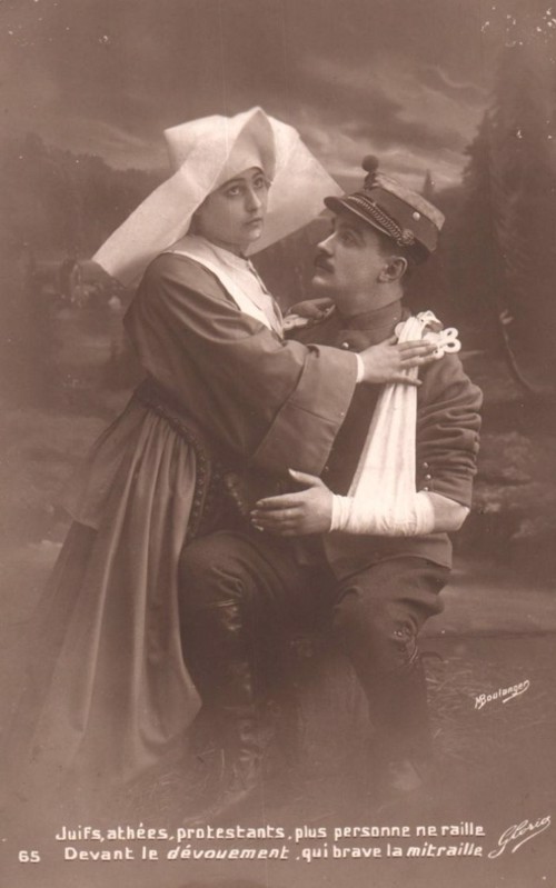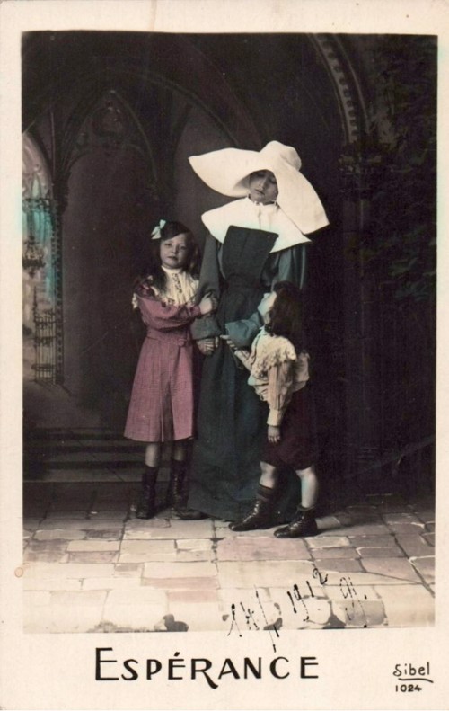 501 502, Sister and nurse 503, with flowers 504, child model 505 Children dressing up 506, Children, crucifix, by Bergeret 507, Children, wounded soldier, by Bergeret 508 509, Toward exile 510, Red Cross Sister and Nurse 511, home visit of the sick 512 513, military salute 514, Sister and a beggar 515, photo by Armand Noyer, 1903 516, Spanish text, French image 517, Hope 518, For the fatherland 519, one child