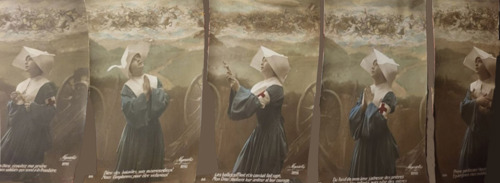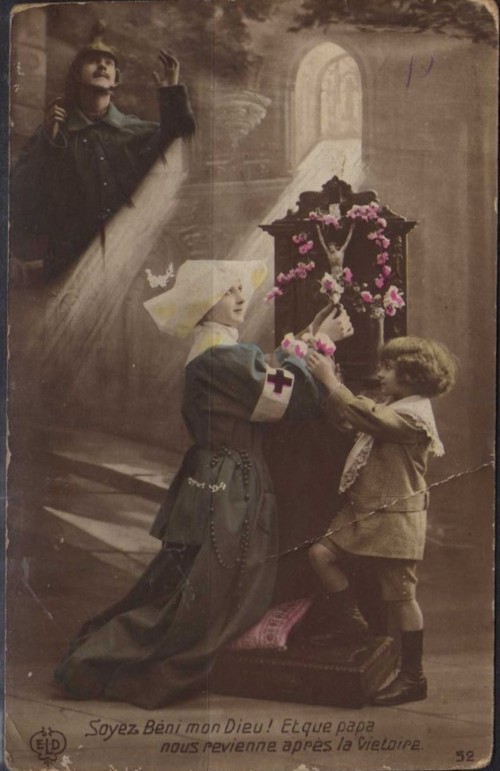 501 502, Sister and nurse 503, with flowers 504, child model 505 Children dressing up 506, Children, crucifix, by Bergeret 507, Children, wounded soldier, by Bergeret 508 509, Toward exile 510, Red Cross Sister and Nurse 511, home visit of the sick 512 513, military salute 514, Sister and a beggar 515, photo by Armand Noyer, 1903 516, Spanish text, French image 517, Hope 518, For the fatherland 519, one child 520, dream of flag 521, dream 522, dream 523, dream 524, The results of France without God 525, God of battles, be merciful 526, Tears, set of five 527, Calvary 528, After the Attack, the portrait 529, Flowers for papa after the victory 530, group of five on battlefield 531, group of four